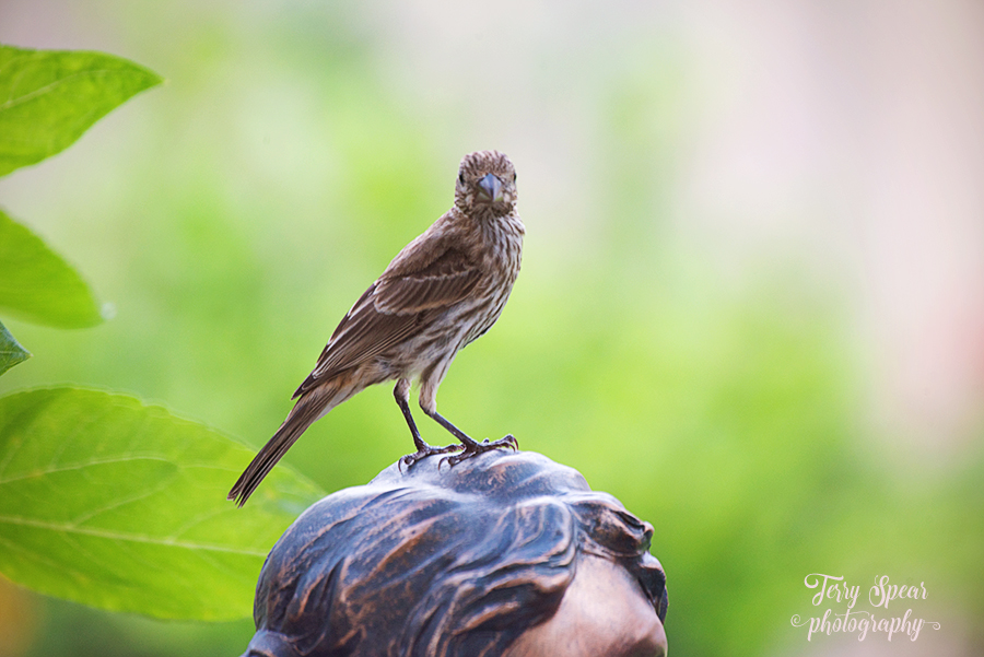 housefinch on water fountain watching me watching her 900 001 Jul1 Published at 900 × 601 in House Finch Getting a Drink Next →